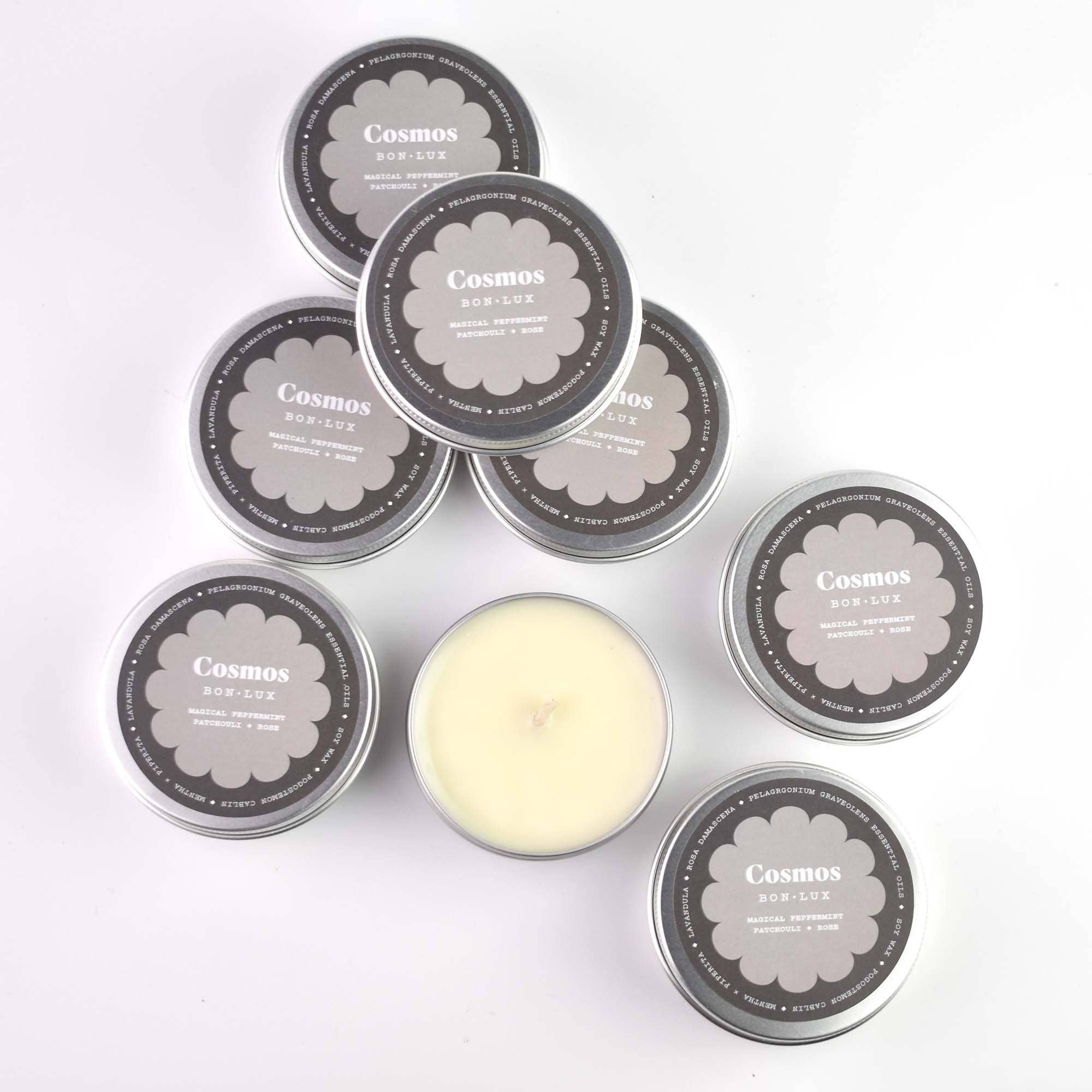 This travel tin candle is companion to COSMOS votive candle and roll on natural perfume.