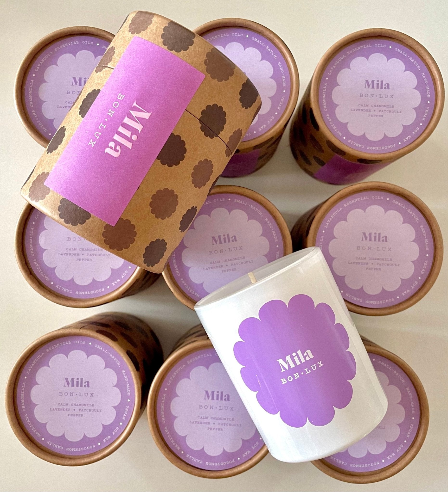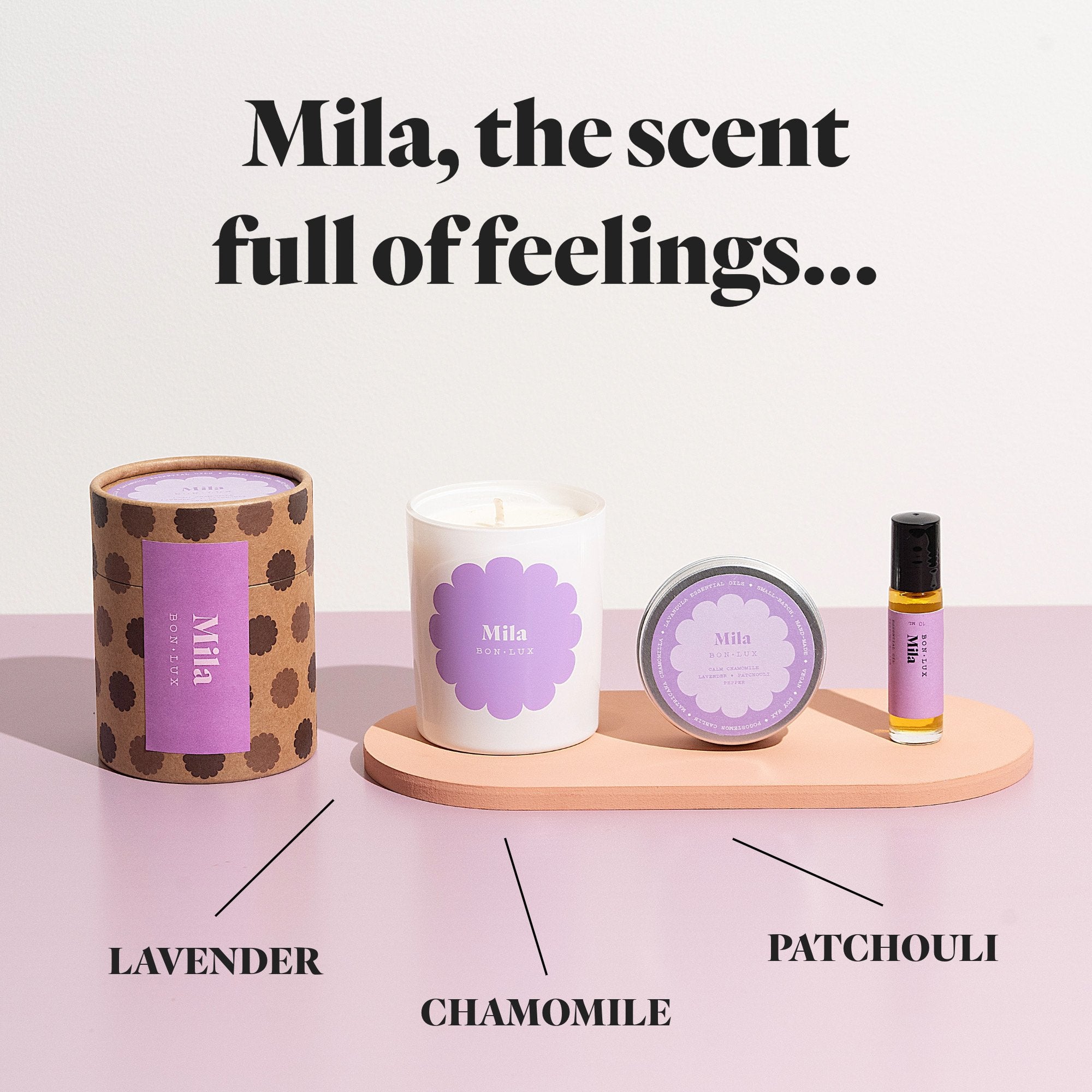 MILA is a lilac mood…a special scent for how we feel right now…a gentle blend, with a top notes of chamomile, lavender and bergamot; anchored with patchouli. Its softly grassy, with flower petals and earthiness; a scent to nurture you.